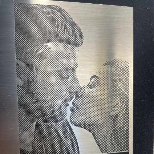 Gravação em aço com técnica de reticulado em preto e branco, garantindo fidelidade à imagem.