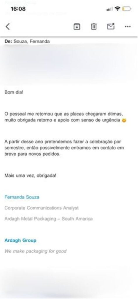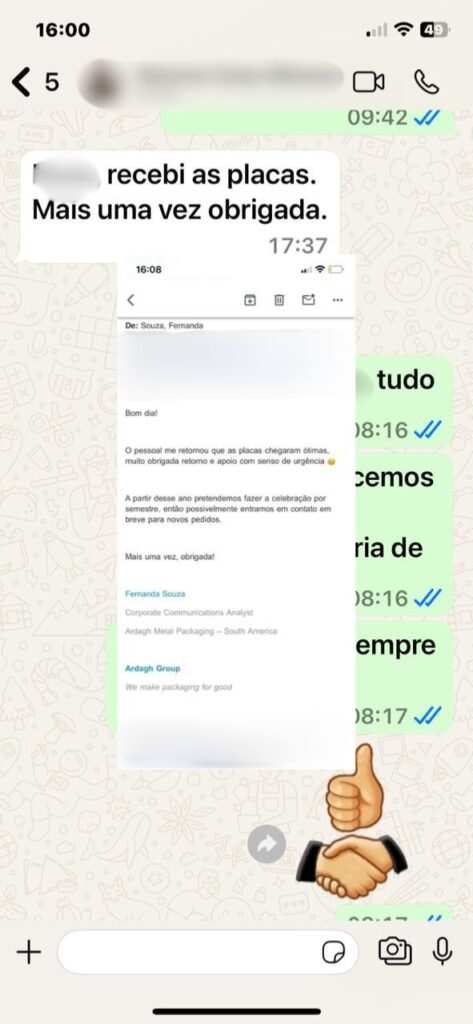 Enviamos a arte para a aprovação. Dependendo do número de placas conseguimos enviar uma amostra física para demonstração de layout e composição.